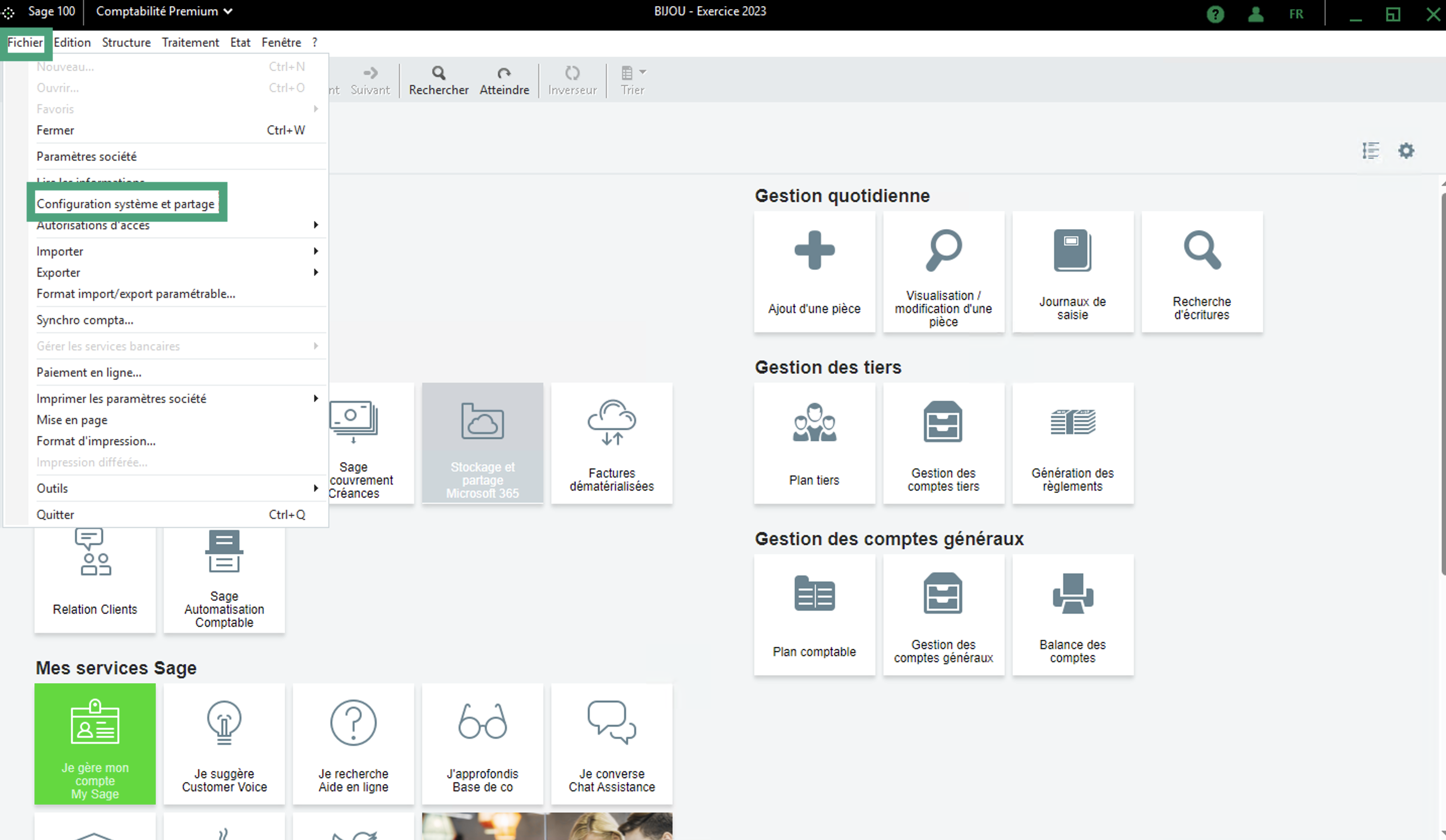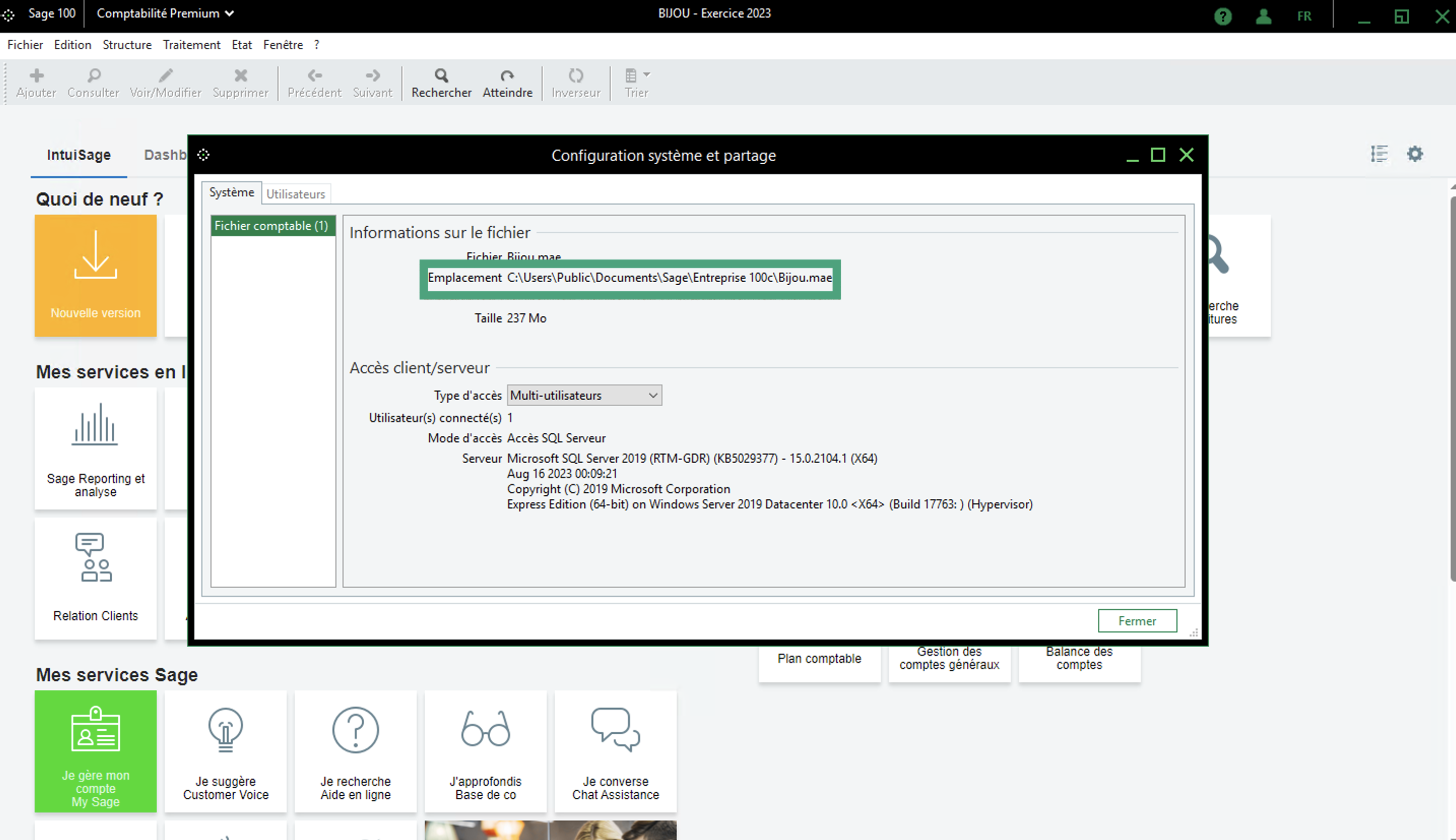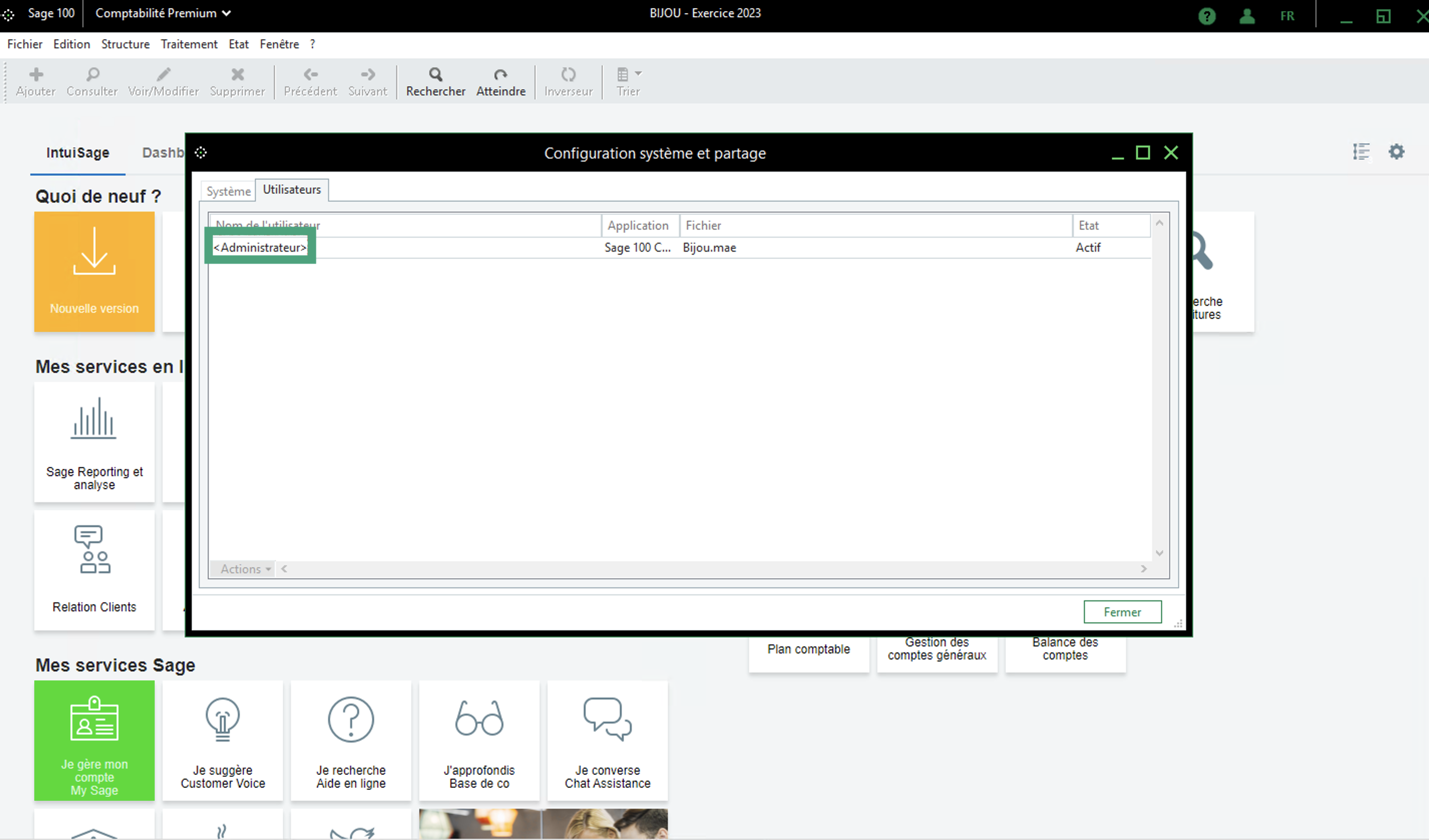 The Sage 100 user name can be retrieved as follows: on your Sage 100 account go to "File" → "System configuration and sharing".