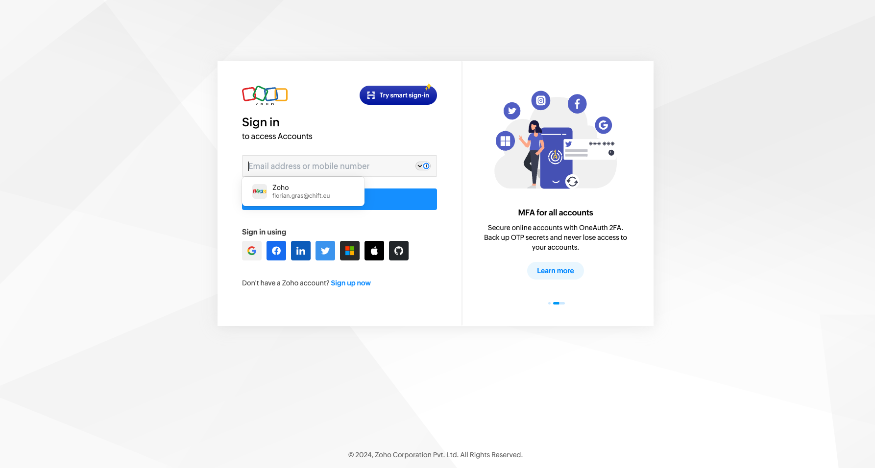 You will be redirected to a ZOHO home page to authenticate your account.