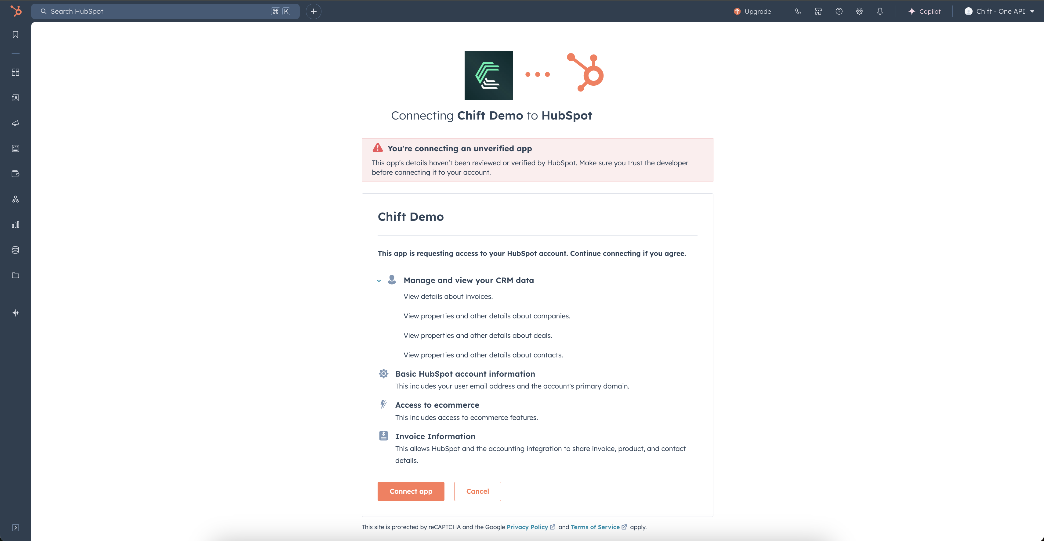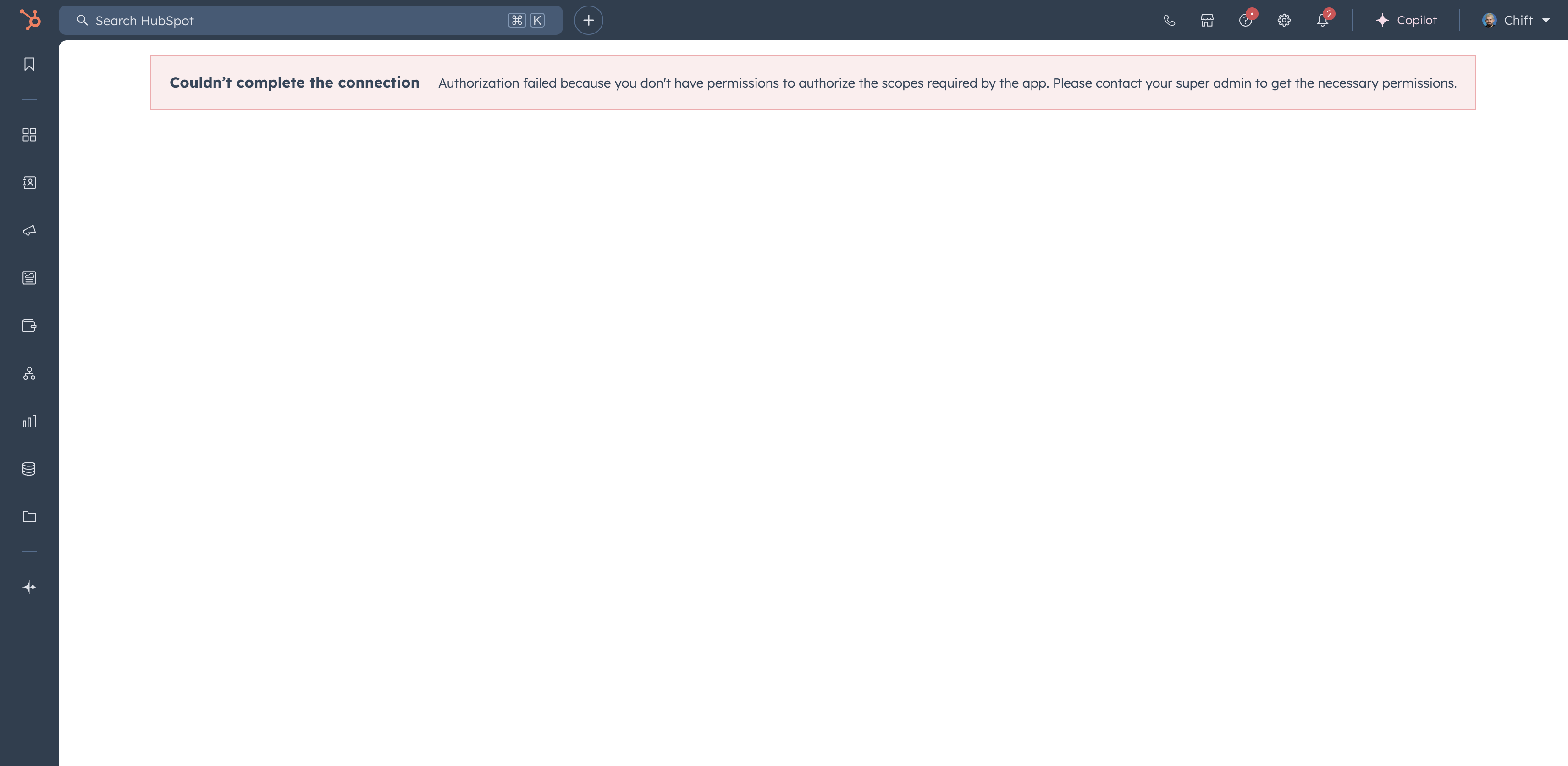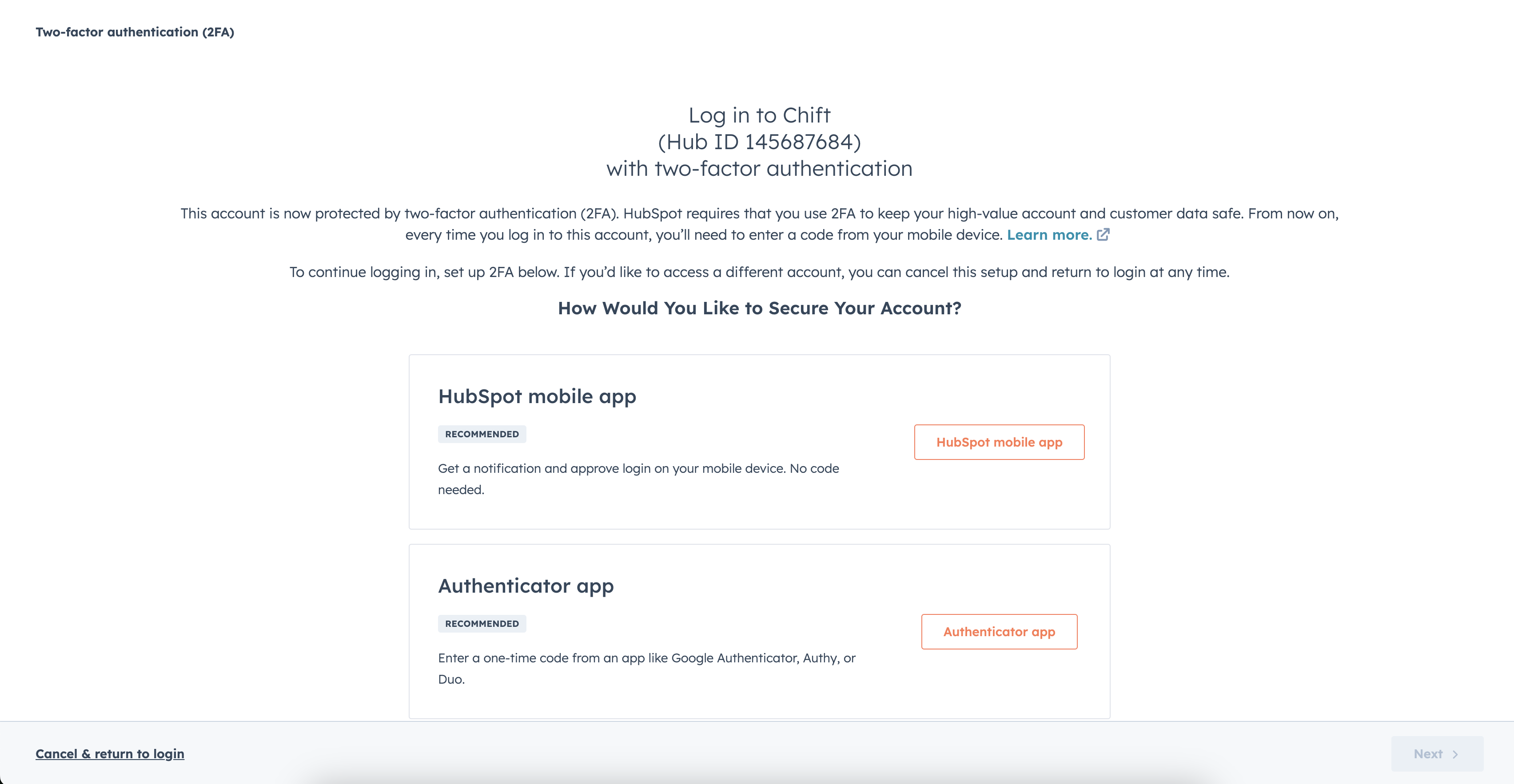 To enable two-factor authentication, you need to go to the Hubspot account and have the rights to access the scopes: