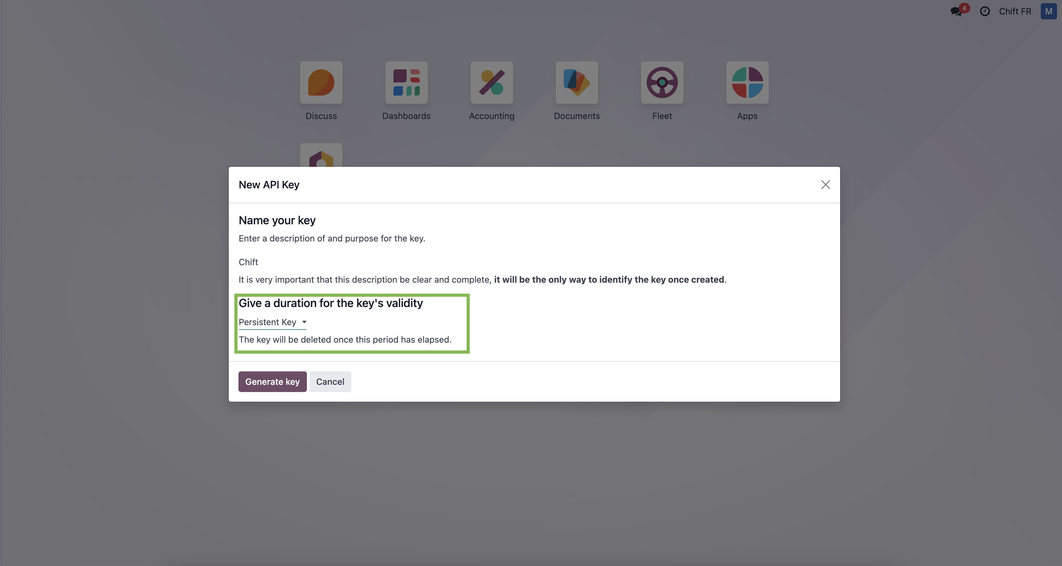 Step 6-6: Here is your API key that you can use in Chift funnel to connect Odoo.