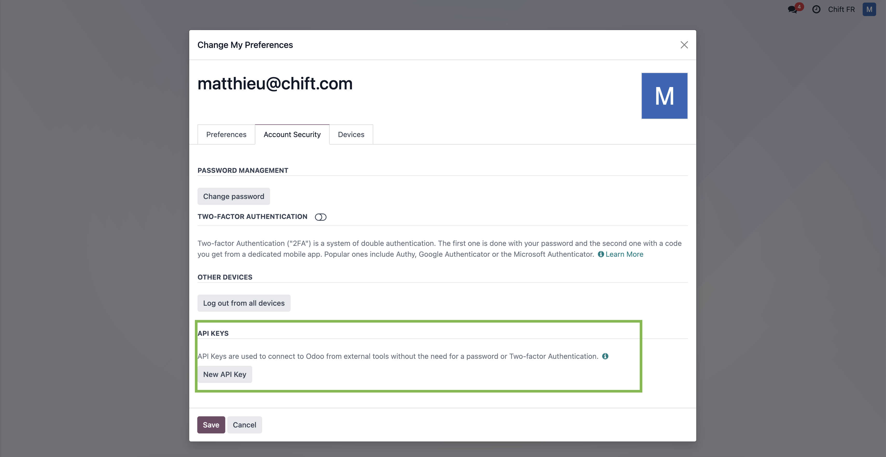 Step 6-1: If you need to generate an API Key, log into Odoo and click on the right top corner button and on "preferences".
