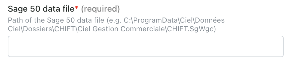 Step 2: Paste the route to the Sage 50 data file which you previously collected from your Sage 50 instance.