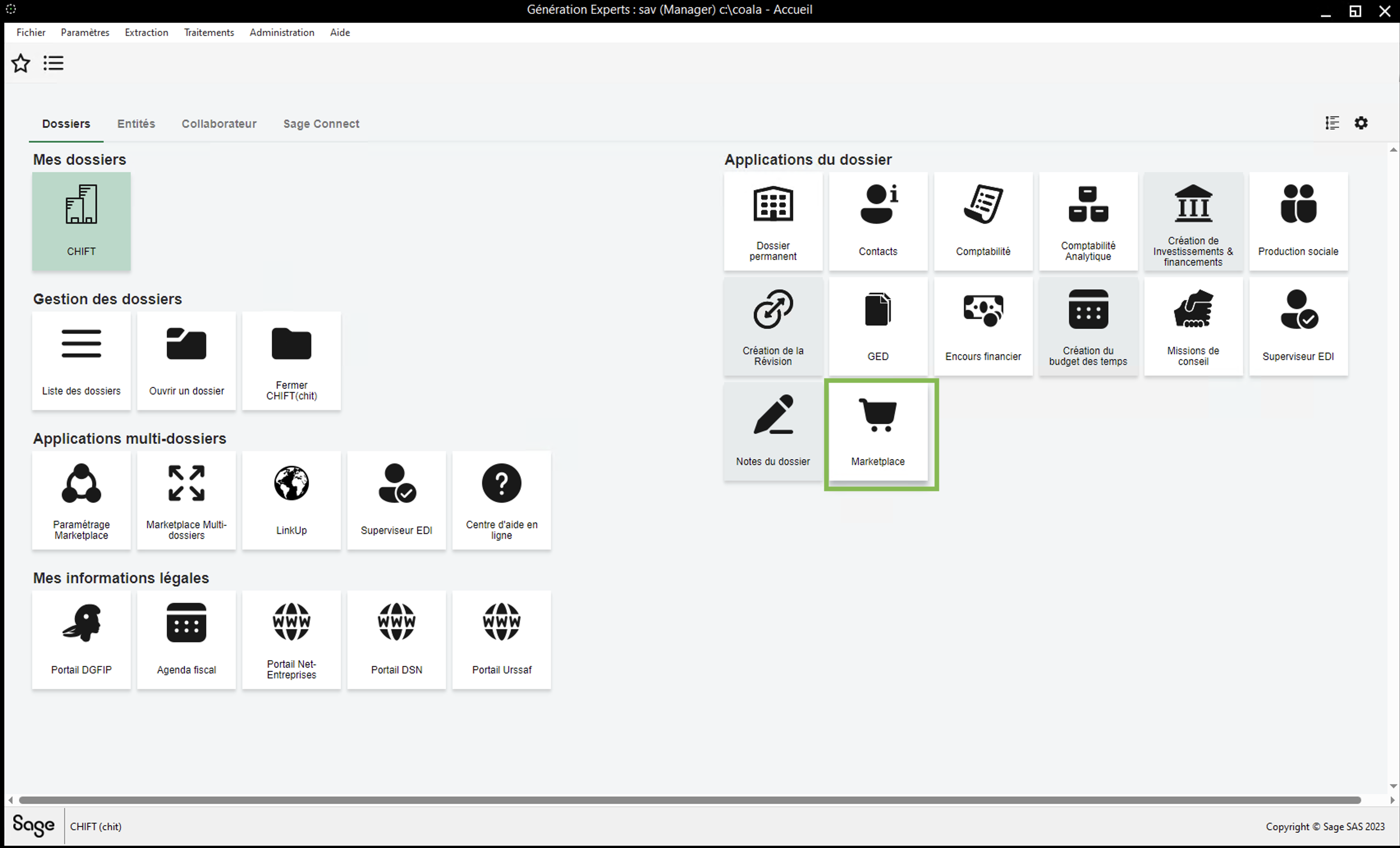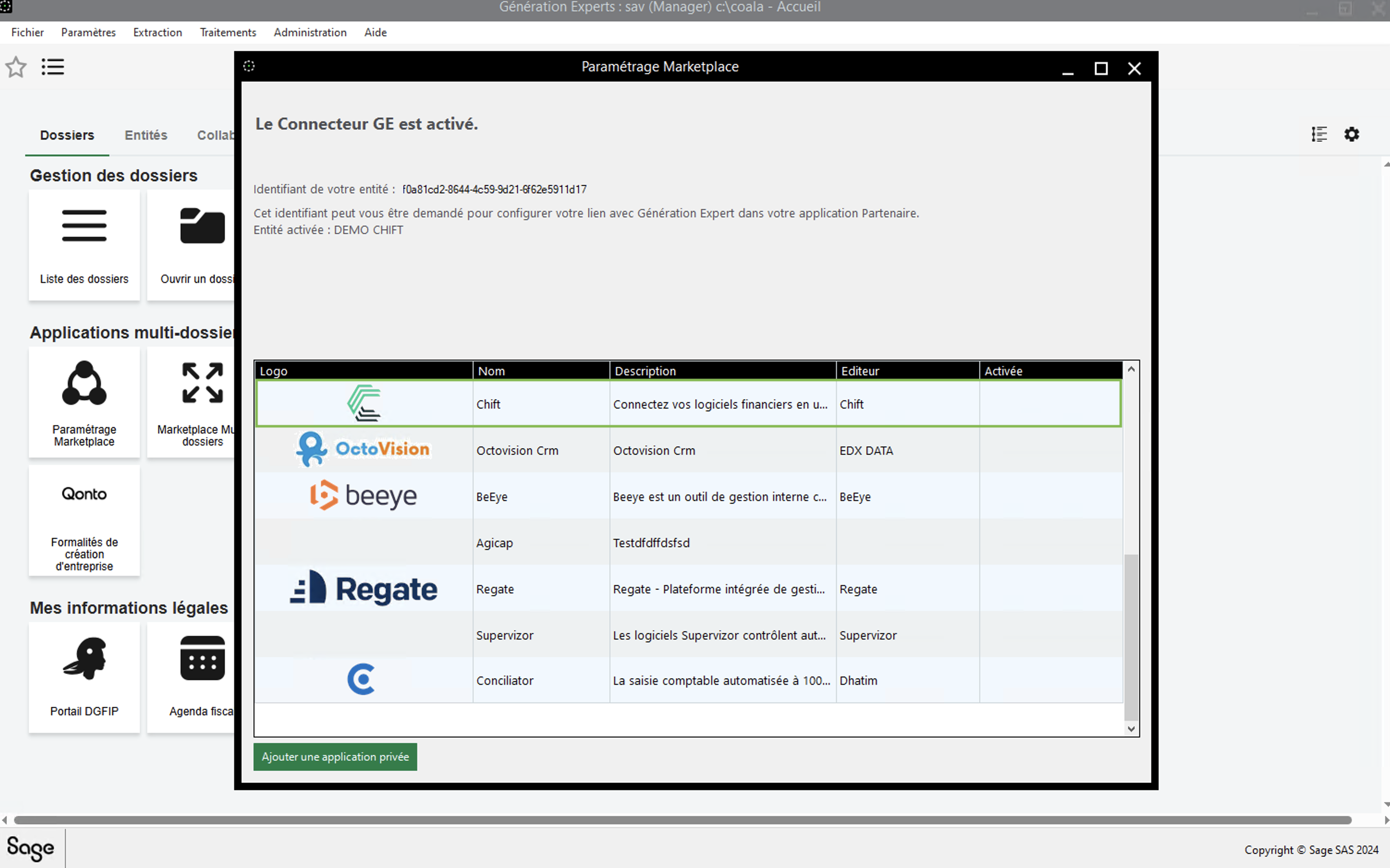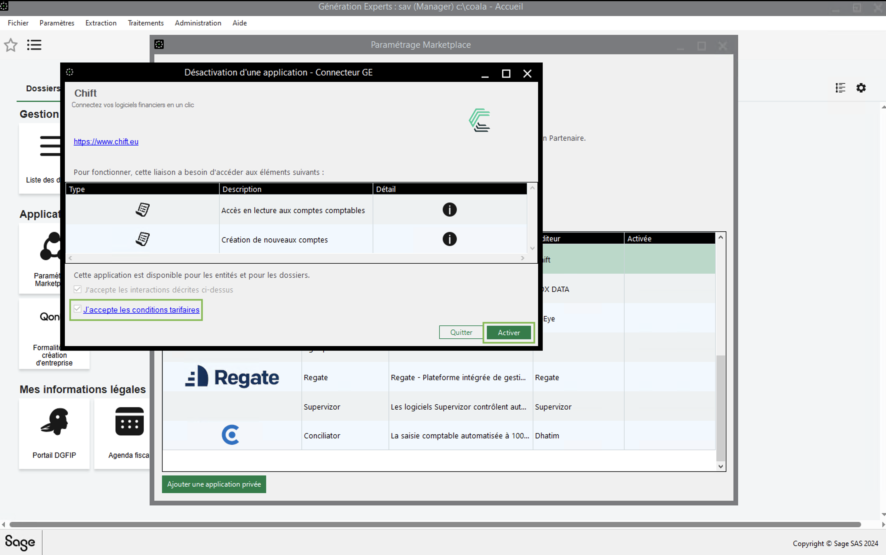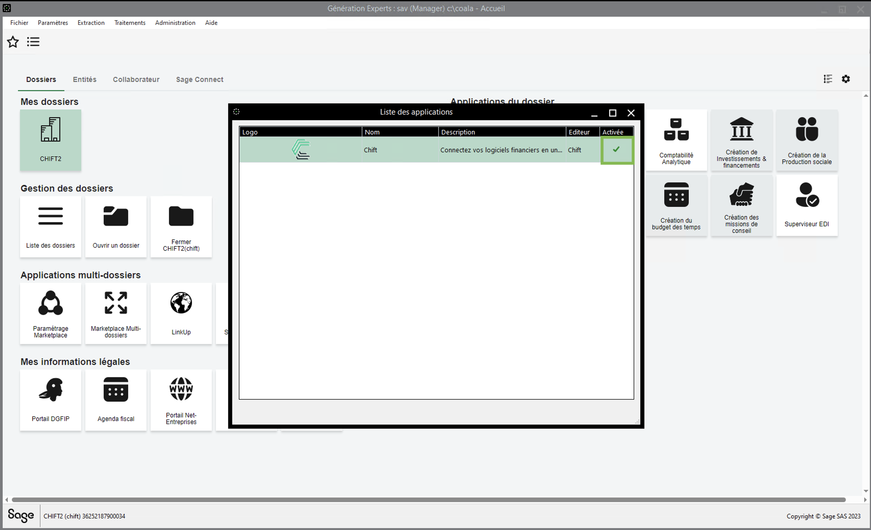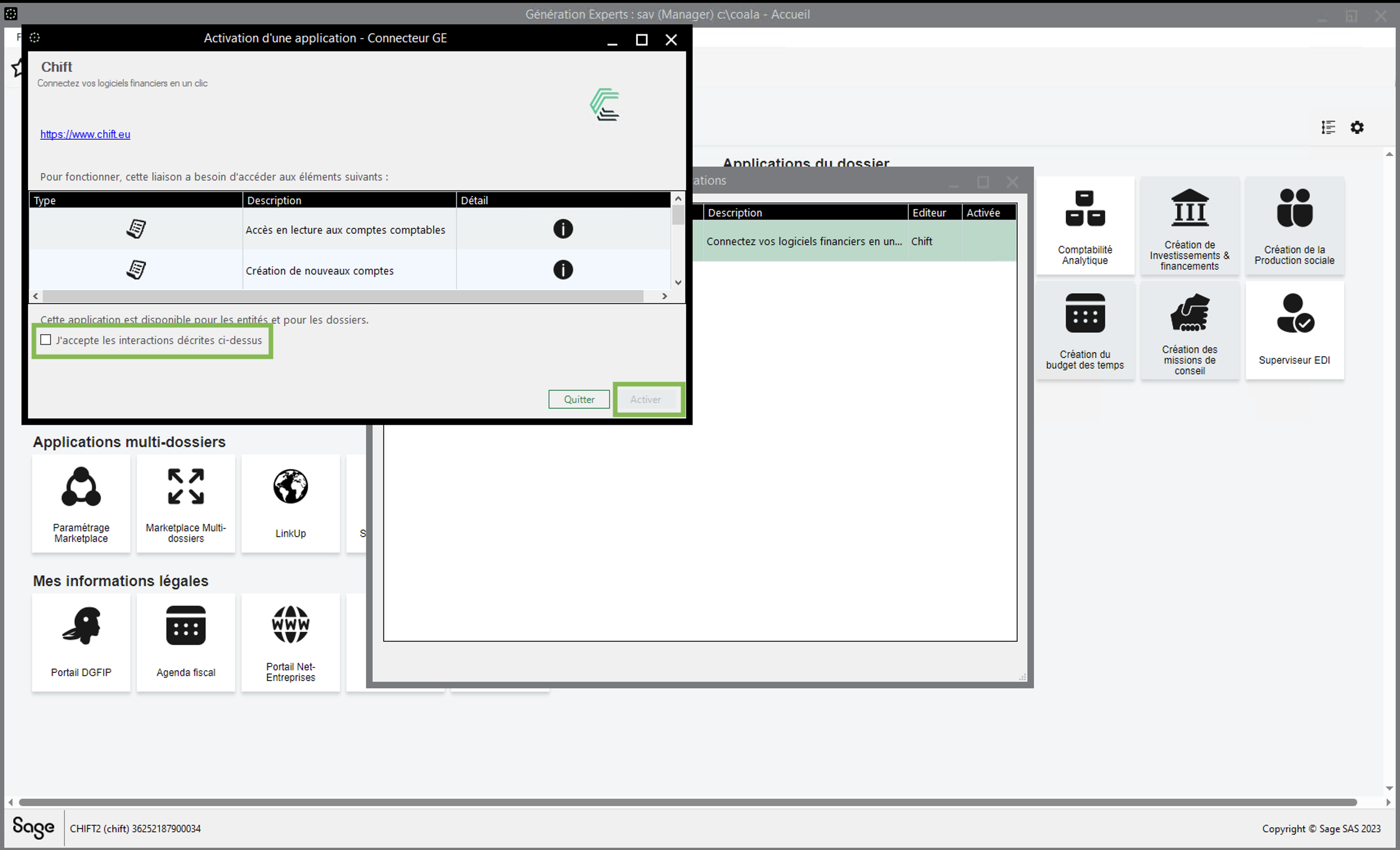 In Sage Génération Experts, you need to activate the public application Chift in order for the data exchange with Sage Génération Experts to work. This consists of 2 steps: