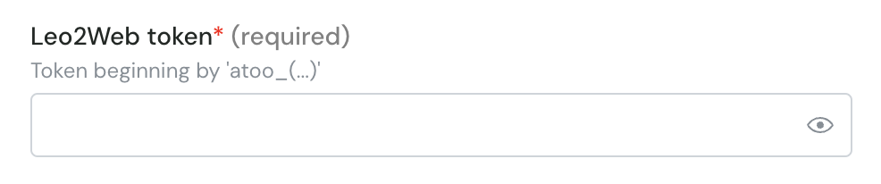 Step 1: Enter the Leo2web token (or Leo2Export/Leo2Stat api key), provided by Leo2