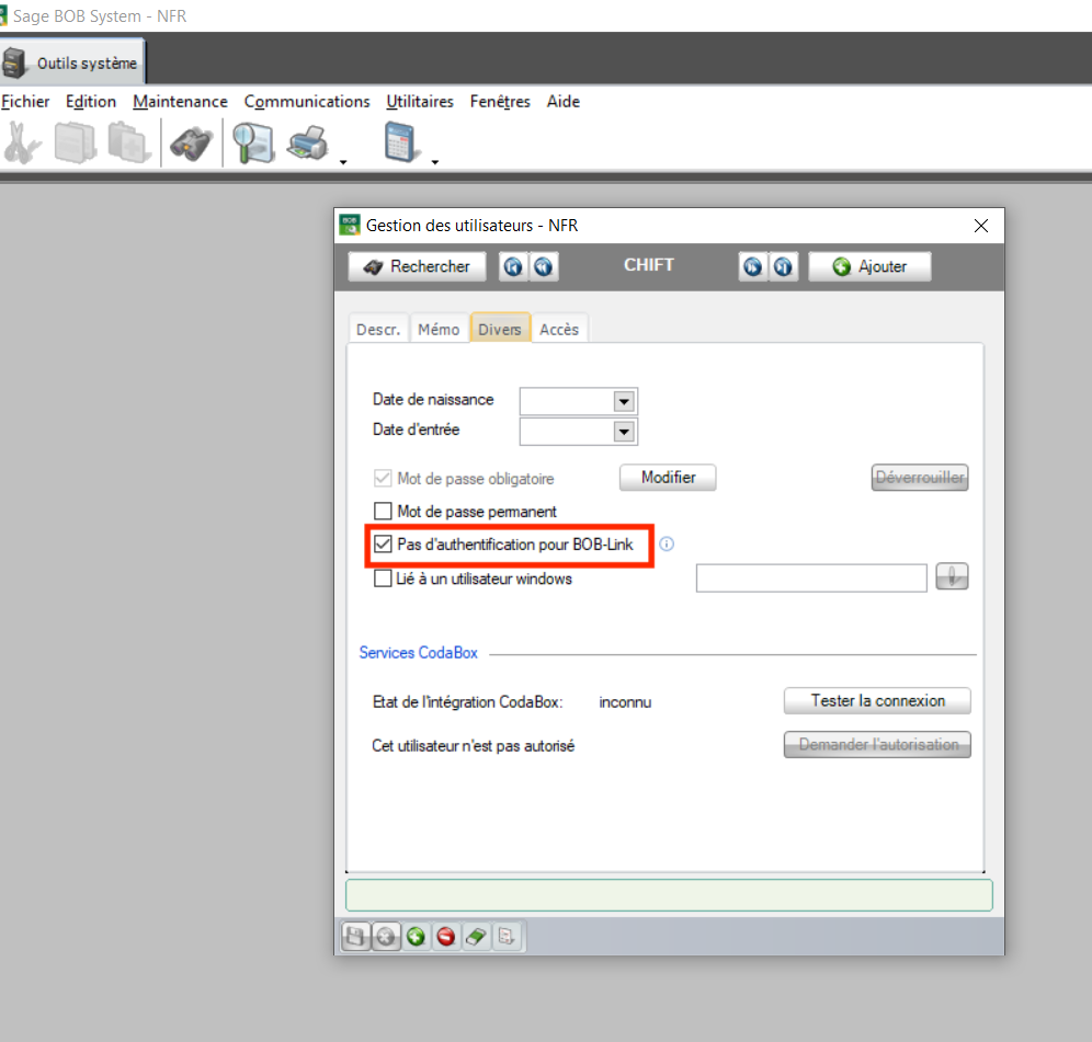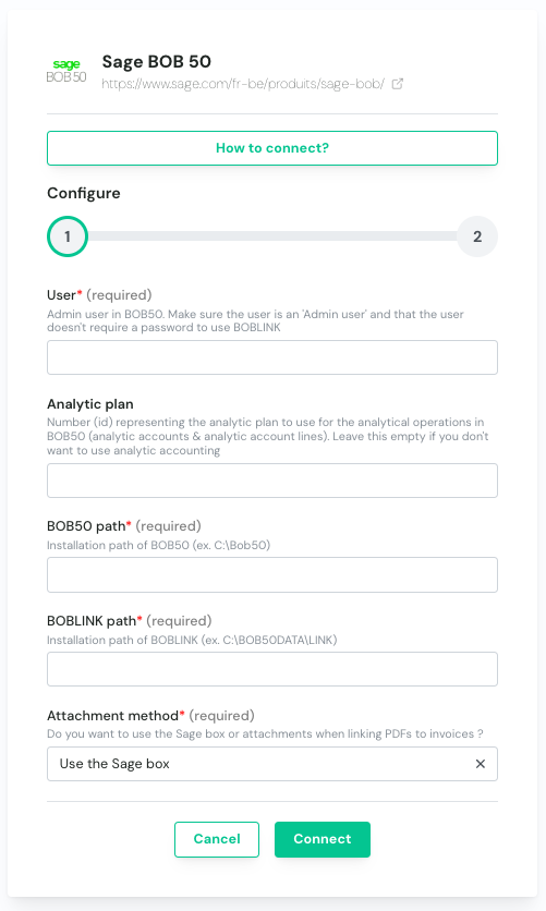 Step 1: Choose a name for your connection (not always shown), username, analytic plan, BOB50 path & BOBLINK path ; then choose if you want to use the sage box or attach pdfs to invoices.