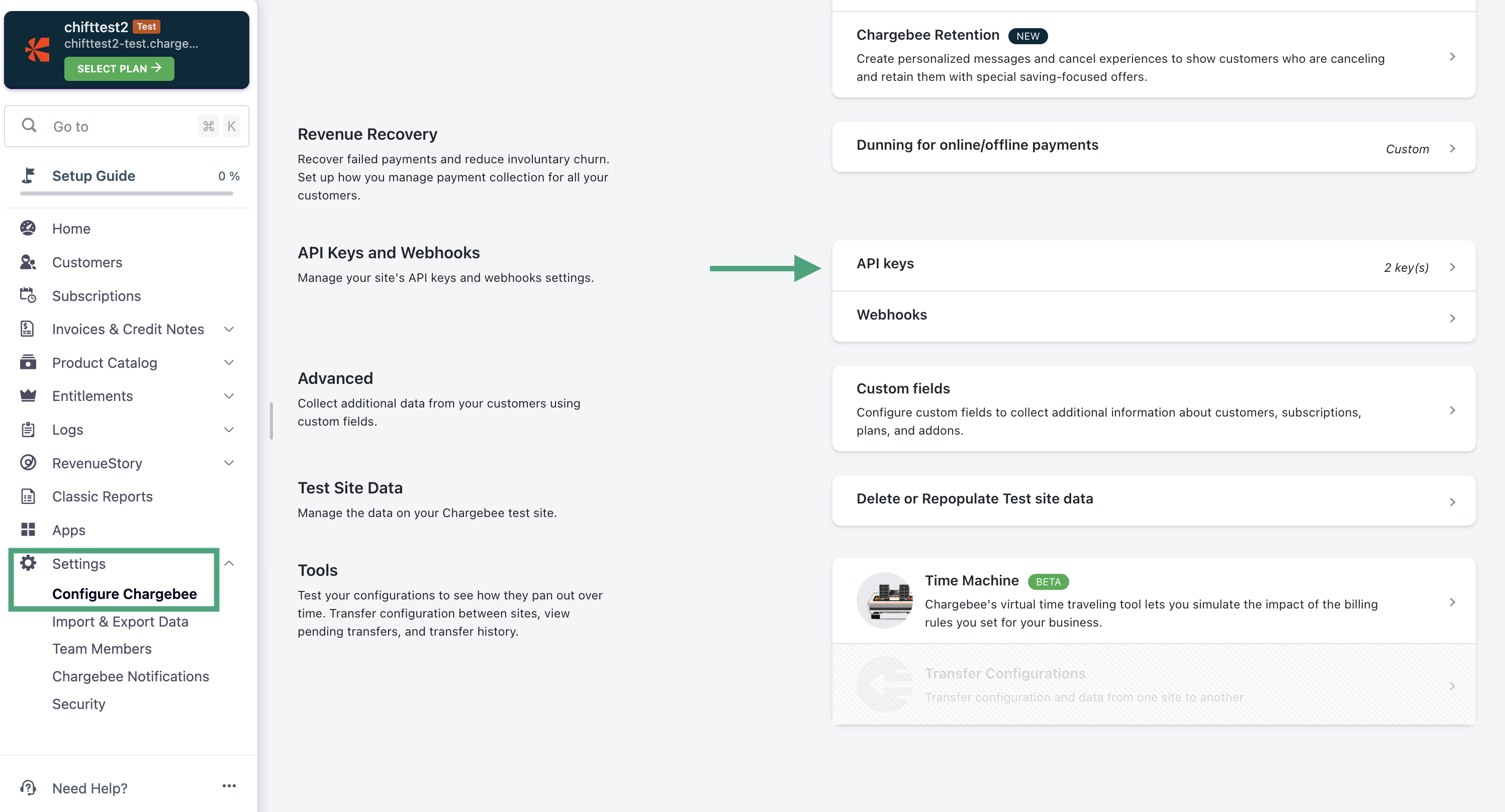 Generate an API key, in the settings of your Chargebee account.