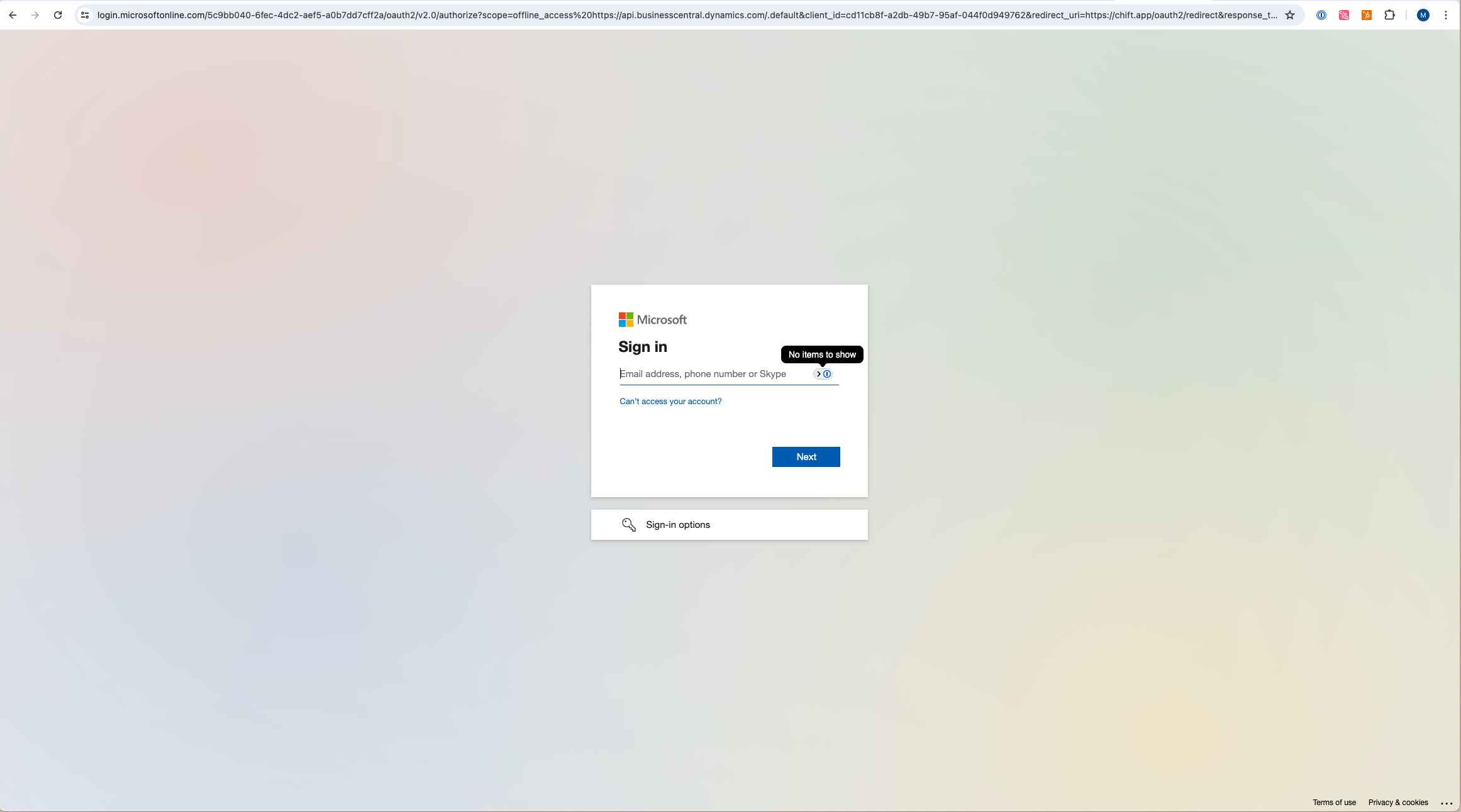 You will be redirected to a Microsoft Dynamics login page to authenticate your account.
